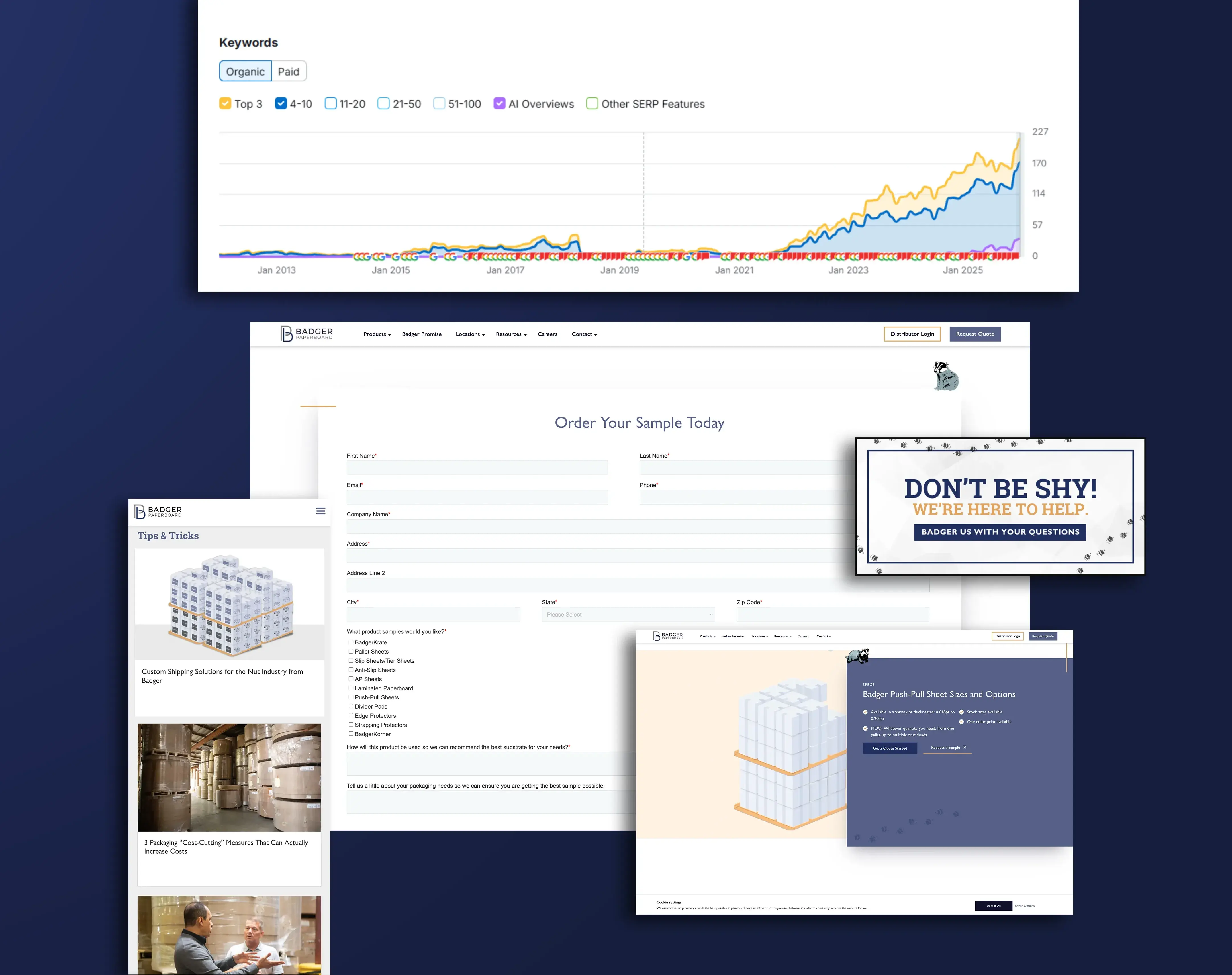 A great website is only as effective as the traffic it receives. We rebuilt Badger's site with lead generation as the primary goal — strong calls to action, optimized product pages and a clear path for buyers to request a sample or request a quote.